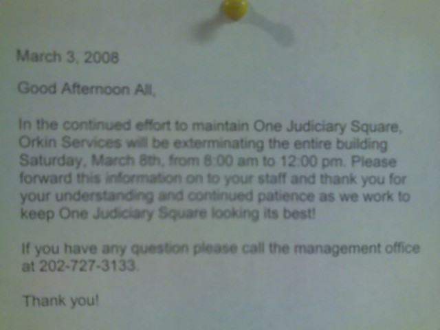 Spotted in One Judiciary Square: The Fenty administration’s “final solution” for weeding out corrupt and inept city employees? At least only D.C. government employees who work on Saturdays are slated for “extermination” this time.