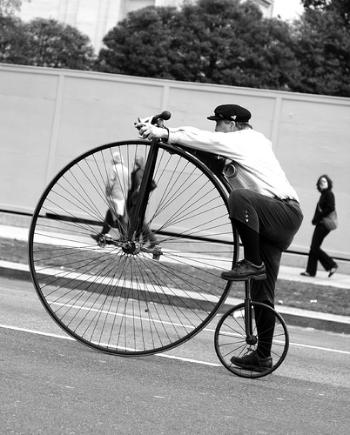 Ah, parades. They bring out not just the celebratory, but the weird and wacky, the fashion challenged, the politicos grasping at any reason to mourn for olden days and, of course, the strange graffiti on latex glove balloons. But we appreciate it when the toys come out for a little performance down the parade route, like this poor guy attempting to maneuver his enormous-tire bike. Flickr user sintixerr caught the rider trying his best to hop back on. EXIF.