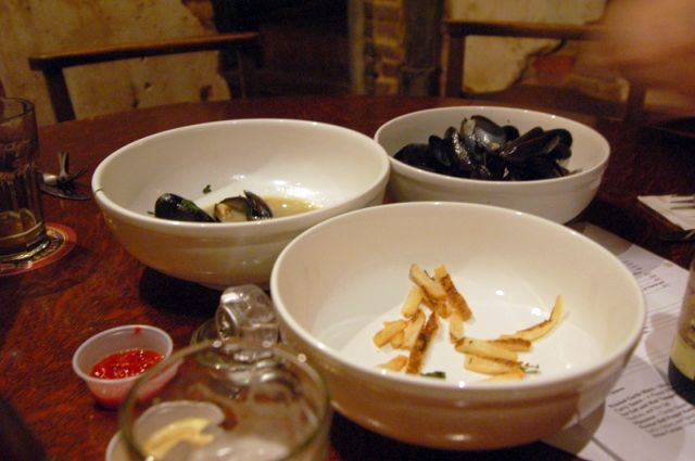 Everyone had been speculating that the event that was originally announced, a taping for a show called America Eats, was merely a setup, and they were right. So Chef Teddy must have had some idea what was happening, and served up bleu cheese and bacon mussels and frites with an off-menu yellow tomato and truffle mayonnaise. Meanwhile, Flay countered with mussels in coconut milk, green chilies and butter, and (surprise surprise) poblano mayo for his frites.