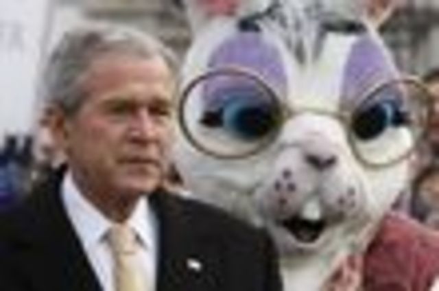 Behold the male version of the White House Easter bunny, pictured here with President Bush this morning at the annual Easter Egg Roll on the South Lawn. Can you imagine being a 5 year-old kid and having that thing coming at you? Free Ride has a photo of the female bunny, which it accurately describes as “hallucinogenic-looking.” Granted, virtually all giant plush costumes could make any child cry, and we all know white rabbits are tough to pull off without making most of us think of drugs, but wow. That is one scary looking bunny.