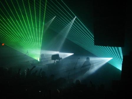 Their live show is their attempt to severely overcompensate for this deficiency with a full on assault to the senses. By the end of the set my nose stung, my eyelids burned and there were little blue stars in the corners of my eyes. Unpleasant aftermath aside, their tactics certainly had the desired effect as the sold out audience full of dancers with glo-sticks ate up every second. Some of the other touring electro-dance acts could learn a few things about presentation from the Austin duo.