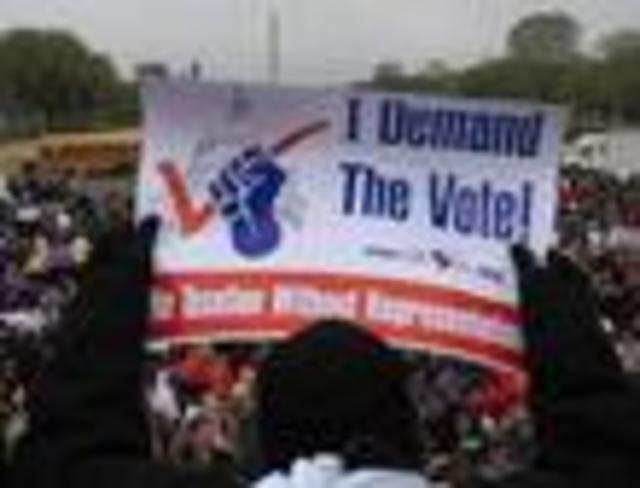 Next Tuesday, April 15 – “Taxed Without Representation” Day – join DC Vote staff, volunteers and activists as we educate citizens about our denial of voting rights and highlight taxation without representation in the nation’s capital. We will circulate postcards and a “wooden nickel” to Senate staffers and visitors to Capitol Hill.