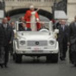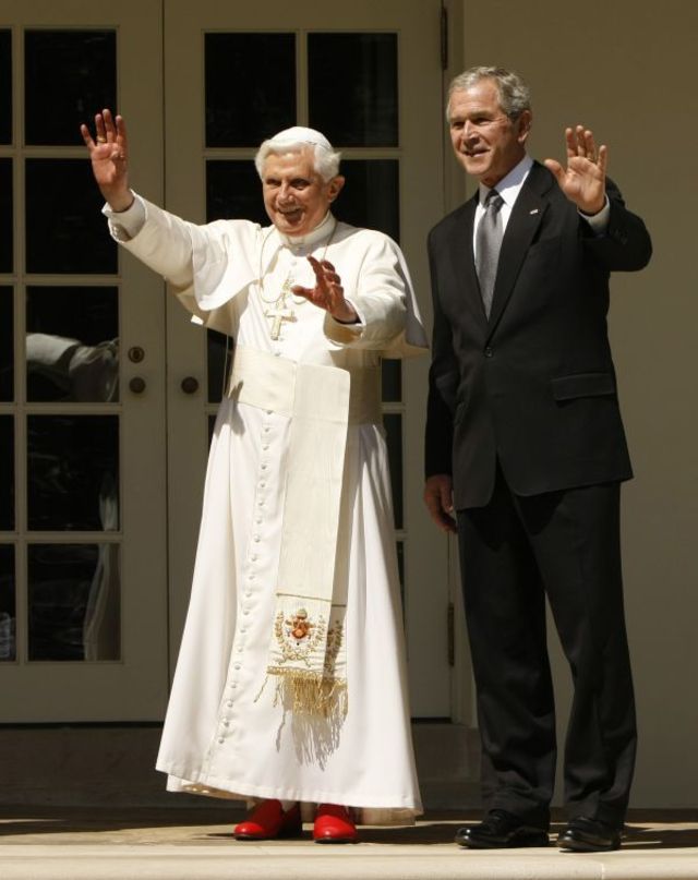 Pope Benedict XVI took to his popemobile after meeting with President Bush at the White House this morning. The pontiff, who is celebrating his 81st birthday today, rode west beginning around noon on Pennsylvania Ave. through Washington Circle before heading north on Rock Creek Parkway before exiting at Massachusetts Ave. to arrive at the Vatican embassy. A large, enthusiastic crowd of about 10,000 gathered to cheer on the Pope as he rode by, rather swiftly we might add. People waved flags, played and sang music and held large signs welcoming Benedict to the United States. And then it was over almost as quickly as it began.