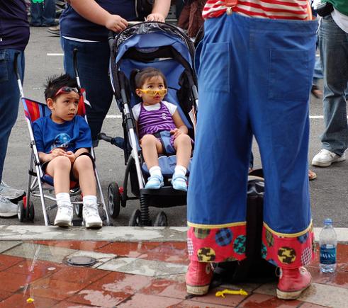 There has been a lot of clown activity in the Flickr pool lately. We featured this horrifying creature a couple weeks ago, who we continue to watch terrorize our nation’s most precious monuments and landmarks. Flickr user erin m watched as these two children learned early the Truth About Clowns, as you can tell from the look of shock and disbelief on their faces. Sorry about the nightmares, kids — we’ve all been there.