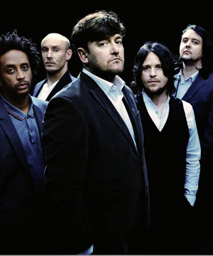 Manchester is a town at the very heart and soul of British music. Bands the likes of The Hollies, the Bee Gees, Simply Red, The Fall, Joy Division, The Smiths, The Stone Roses and Oasis form a musical legacy that’s second to none. In 2001, Elbow became the city’s latest musical crown jewel after their debut record Asleep at the Back was nominated for the Mercury Music Prize. Their brand of progressive, gloomy yet evocative rock has brought them plaudits and critical recognition while also separating themselves from the soft, acoustic based rock that dominates the UK charts. Coldplay they are not, but that’s a good thing. The band released their latest effort, titled The Seldom Seen Kid, earlier this week and they start their US tour tomorrow in New York City. Their show Sunday at the Sixth & I Historic Synagogue is one of two shows they’ll be playing on the East Coast. We spoke to front man and lyricist Guy Garvey yesterday (he’s the dashing looking chap in the middle of the photo to the right), just a few hours after he stepped off a flight from England.