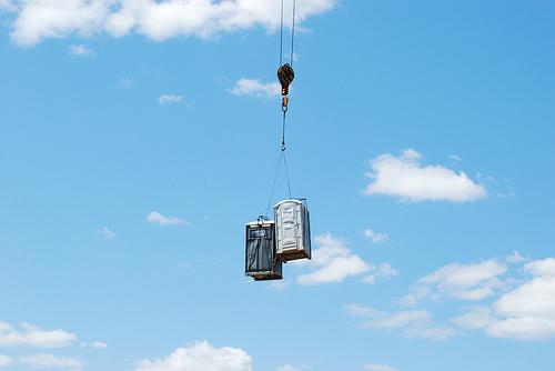 Awesome. Flickr user lovedc (we love the name!) caught these two portapotties being hauled, for some reason, by crane over a construction site in Southeast. This may call for a Friday caption game. Do your worst in the comments, folks.