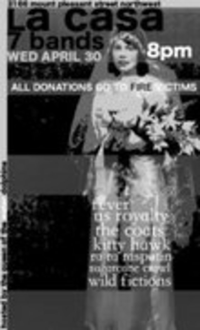 Tonight’s show at La Casa with Kitty Hawk, Sugarcane Crawl, Fever, Wild Fictions, U.S. Royalty, The Coats and Ra Ra Rasputin will take place at La Casa at 3166 Mt. Pleasant Street NW. Doors open at 7:30 p.m. and the first band will go on at 8 p.m. All donations will go to victims of the Mt. Pleasant Street fire.