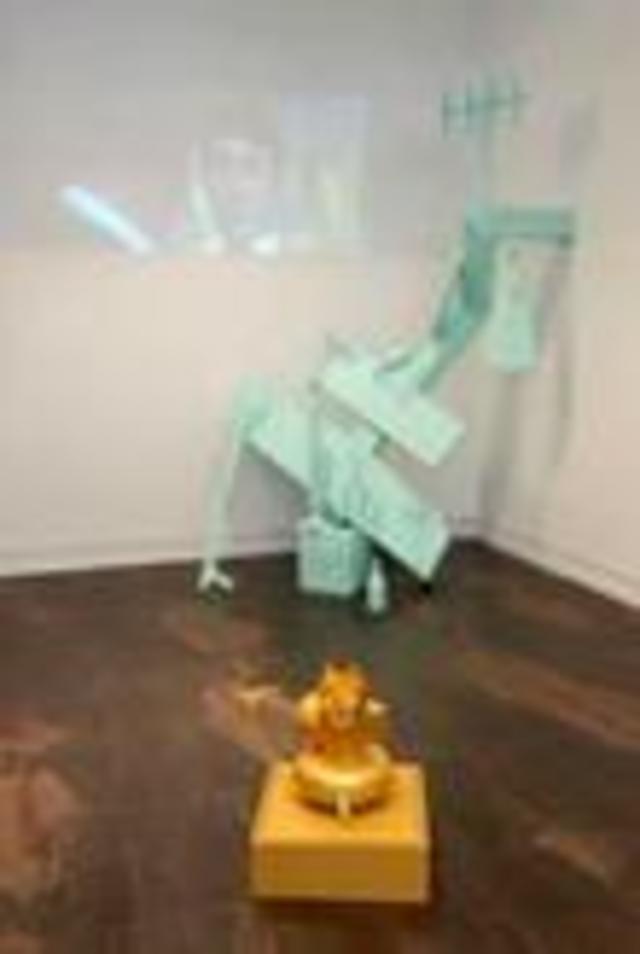 Either a brilliant display of art interpreting life or just the rambling manifestations of the artist, Jurgensen’s sculptures are highly fascinating for, at least, their use of material. Predominantly made from medium density fiberboard, Jurgensen layers sheets of the common material to carve out shapes of everyday objects, such as flashlights, bikes, wine bottles, lamps and air compressors. The objects are so close to reality that they look like the real thing, only covered in thick layers of paint. He arranges the objects in hodge-podge, unwieldy vignettes painted all one color. He then bestows wordy titles that need to be shortened to just their color for a name. And just like the randomness of the Internet and what the masses deem popular or interesting, Jurgensen’s sculptures are reflective of what he is interested in and attracted to.