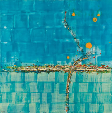 An abstract mixed media artist and oil painter, Arkin and her bright, colorful works are represented by the Nevin Kelly Gallery. Her 32″ x 32″ encaustic Waterloo is pictured right. Arkin is also exhibiting seven new works alongside Willem de Looper at Dupont’s PASS Gallery until May 30. PASS will be open on Saturday, and you can also stop by Arkin’s studio a few blocks south of the gallery on Church Street to view a few of her new large pieces as well as a number of older, smaller works.