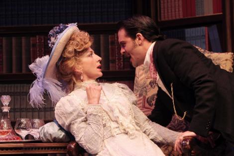 Still, there’s more to like than sneer about in School — Norris’ and Sabin’s sparring may never reach the level of wordplay of a Beatrice and Benedict-style affair, but it’s still very amusing to watch the pair play off each other. Laura C. Harris, who plays the naive Maria, just about the only female in the work who finds nothing fun about backbiting, has a fairly short resume, but her fine work as the play’s moral compass shows her as an actress on the rise. And a great contrast to her is Catherine Flye as the shameless Mrs. Candour, who manages to make a speech impediment-driven gag remain funny throughout.