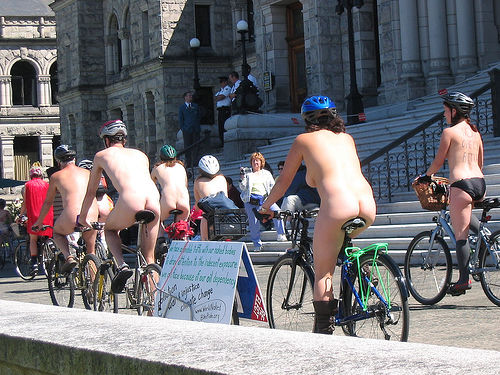 A flyer on the group’s web site, which is part of a large, world-wide network of fairly well-attended naked rides in other cities, states that participants will “ride in order to draw attention to oil dependency and the negative social and environmental impacts of a car dominated culture.”