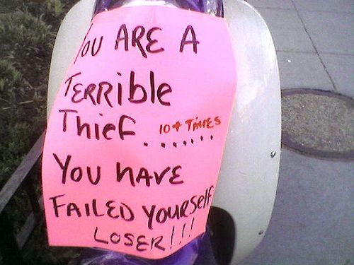 PassiveAggressiveNotes.com spots this scooter in D.C.’s Mt. Pleasant neighborhood all decked out in angry, belittling and sometimes profane messages to a failed thief. Check out the full post for more photos, sent in by a resident who notes the irony of the neighborhood’s name when matched with the sentiments expressed in the scooter notes. I can’t help but be reminded looking at these photos why I eventually decided not to buy a scooter last year, even though I sort of really wanted one.