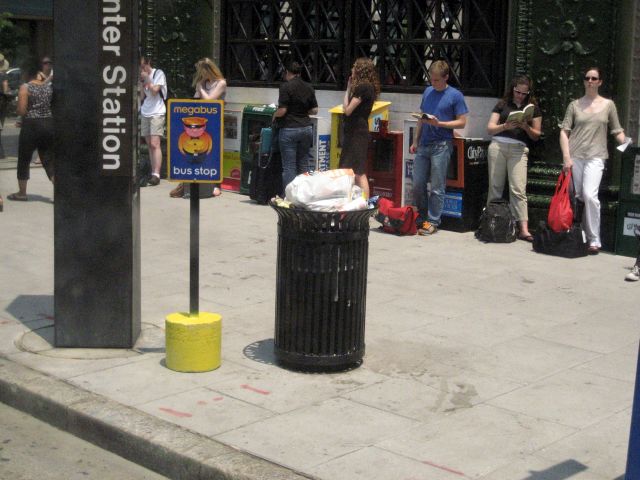 Somehow we missed the news that UK-based Megabus.com (which began its first service in the U.S. in Chicago in 2006) began running low-cost bus service between D.C. and New York on May 30. We spotted this Megabus bus stop sign outside Metro Center on Friday.