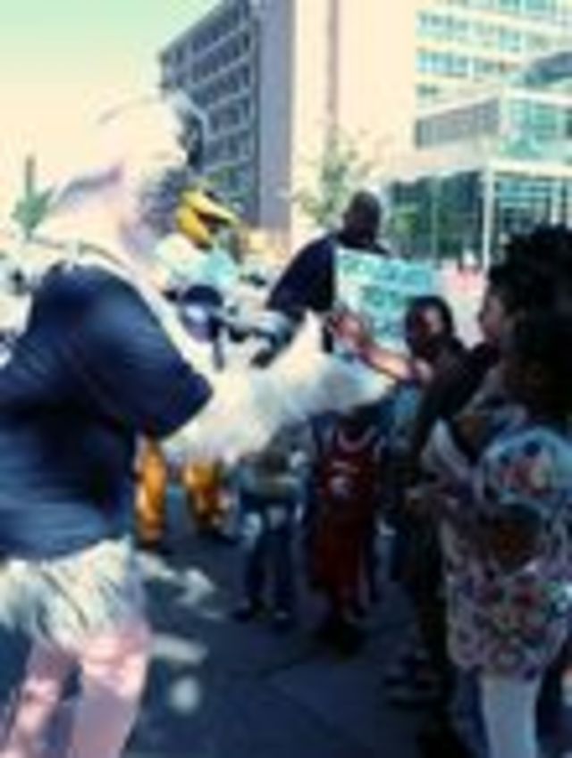 It’s been a bizarre week in D.C. education, as ostriches rallied on 14th St. and seemingly everyone from Katie Couric to Al Sharpton had their eye on the District’s schools. Thursday was the last day of classes for DCPS students, and while Mayor Adrian Fenty and Schools Chancellor Michelle Rhee commemorated the one year anniversary of the schools takeover at a press conference at Langdon Elementary, a smaller gathering at the corner of 14th and U streets NW attracted some curious looks and the occasional honk of support. DC Voice, a local organization focused on community involvement in schools, was introducing their new mascot, an ostrich meant to push parents and community members to “get their heads out of the sand and become involved in public education.”