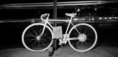 Ghost bikes are somber memorials for bicyclists who are killed or hit on the street. A bicycle which has been painted white will be locked to a street sign near the crash site to serve as a reminder of the tragedy and as a quiet statement in support of cyclists’ right to safe travel. Cyclists and others who attend the ceremony are encouraged to bring bike lights and flowers.