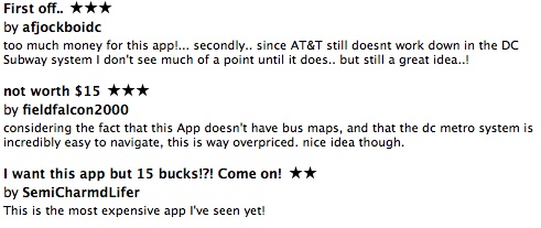 We know that plenty of you are getting all psyched about the new 3G iPhone, which is set to deliver tomorrow morning. (Hopefully, this release won’t result in as much cutting in line as the first incarnation of the much-sought after gadget.) Via We Love DC, it appears that some intrepid developers have created a new iPhone navigation application called iTrans DC (link requires iTunes), which allows you to access published Metro times. Sounds cool, but $15 seems like an outrageous amount to pay for information that you can easily get from WMATA or Meenster, with just a couple additional clicks of your finger. Some of the early iTrans DC reviewers are also skeptical. We’ve pasted them below: