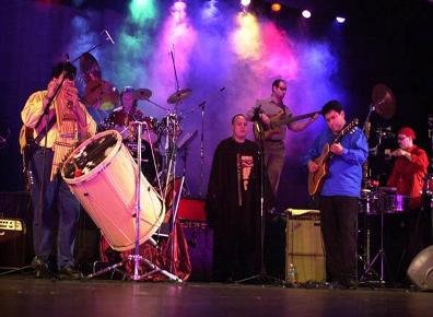 Mystic Warriors, led by Andres and Marco Mallea, specializes in music that comes from the Aymara culture of the Andes. Their sound is built around the pan flute and several traditional wind instruments, which included the charango, a lute-like instrument (the electric incarnation was featured last night), a variety of drums ranging from traditional animal skin instruments, congas, and a modern drum set. The group also featured electric bass and synthesized string sounds.