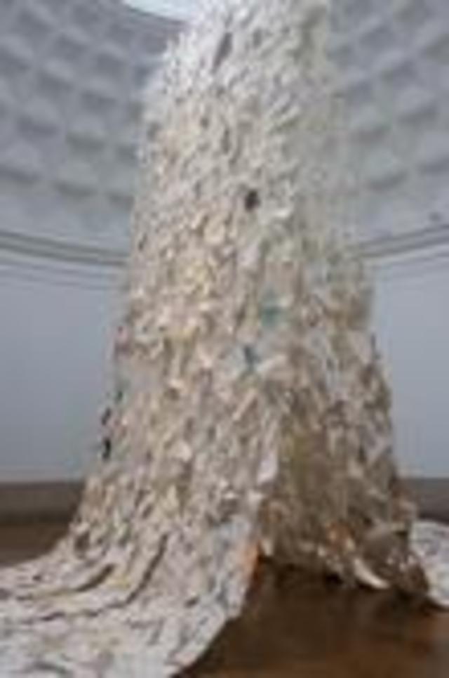 Elena del Rivero’s [Swi:t] Home: A Chant, 2001–2006, installation of found papers mended, burnt, embroidered, and stitched to five rolls of muslin. Courtesy of the Corcoran Gallery of Art, Washington, D.C., and the artist. (c) Elena del Rivero. |