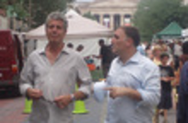 We spotted Bourdain yesterday afternoon at the weekly Penn Quarter FRESHFARM market, accompanied by new BFF (unconfirmed) Chef José Andrés. Together, they spent the better part of an hour visiting each vendor as Andrés expounded on the revolution in American cuisine, particularly in D.C. They then escaped the gazes of curious onlookers into Andrés’s Café Atlantico.