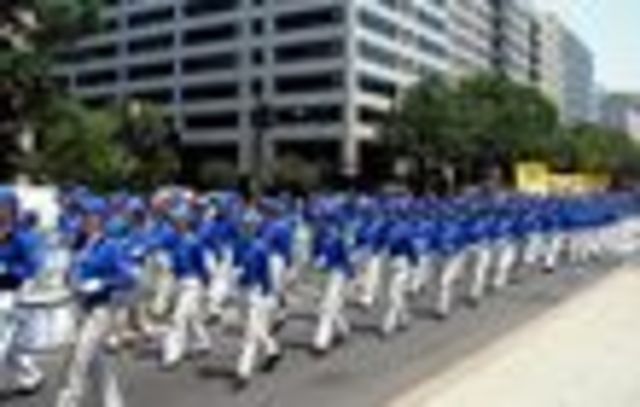Adherents of the Falun Gong spiritual discipline protested in Washington today against the 2008 Olympic Games set to be held in Beijing, China. Falun Gong members say they are persecuted by the Chinese government and want President Bush to agree not to attend the opening ceremonies next month. Photo by Bullneck.