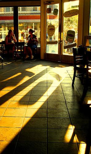 Flickr user LaTur shot an-otherwise mundane coffee shop scene and made it spectacular by capturing the afternoon light. The composition draws emphasis to the tiled floor. We love the yellow tones and long shadows that stretch across the vast white space of the floor. EXIF.