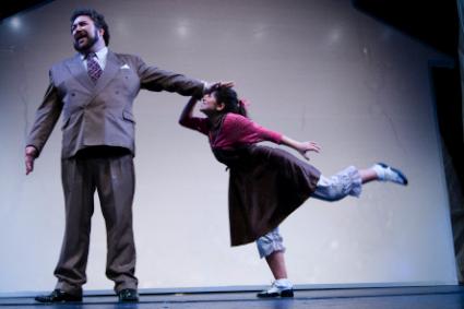 Thornton Wilder’s The Skin Of Our Teeth, despite having won a Pulitzer, is a play that’s hard to appreciate on anything more than an intellectual level. It’s clear the author’s intent (mostly a commentary on the devastation of war and how we’re destined to repeat our mistakes). There are more than a few clever literary allusions, many of them Biblical. The play’s dour, end-of-the-world message certainly resonates in contemporary times. And you have to give the playwright credit for being “meta” long before the term was popularized, as he teasingly toys with narration, setting the show in a play within a play where it’s easy to forget he’s doing so until we’re abruptly interrupted by the musings of a histrionic actress.