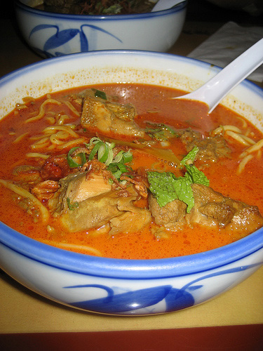 The first time I tasted curry laksa, it was prepared by a Singaporean friend, who I watched cleave piles of dark meat into an enormous stew pot before putting in a number of different spices. What came out was a questionable, murky soup with spicy red oil floating on top. But wow, was it delicious.