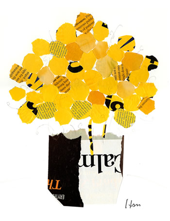 A new project of Exit Clov‘s Hsu sisters called imoM, which stands for “in memory of Ming,” fills two squares of space with soft, colorful, enchanting collages. About 15 images are printed on notecards, and two are printed larger at 12 x 18”. Most mesmerizing are the depictions of flower vases using colorful shreds of text-filled paper, displaying varying sizes of letters and words like “anxiety” and the upside-down and cropped “calm” (pictured right). ImoM works are not created by the Hsu sisters themselves, but by their Dad, Ming-Yen Hsu, who died in May of last year after a thirty-seven year battle with a recurring brain tumor. Emily Hsu spoke to us over the weekend about why she and her sister decided to begin the imoM project.