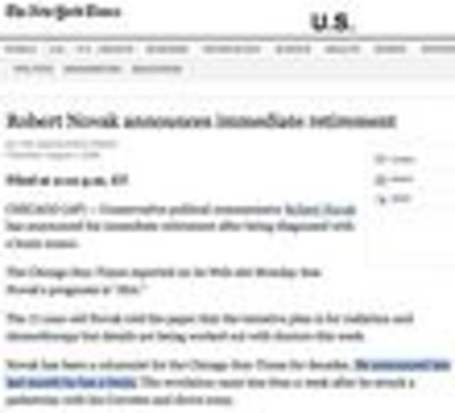 They’ve already fixed it, but the error above in the Associated Press story about Robert Novak’s immediate retirement was live on The New York Times web site for a short time earlier this afternoon. Yikes! The conservative columnist may be widely known as the “Prince of Darkness,” but brain tumors are certainly no laughing matter. Except, it turns out, when they lead to mistakes like this. Too soon?