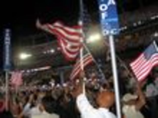 Photo of Washington D.C. Mayor Adrian Fenty waving the American flag toward the end of Obama’s speech by DCist’s Sommer Mathis