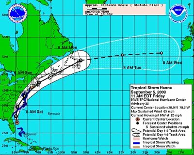 We don’t want to minimize the seriousness of the threat Tropical Storm/Maybe Category 1 Hurricane Hanna potentially poses to the D.C. Metro area. As of mid-day on Friday, our favorite weather guys are saying 2-4 inches of rain and winds that could reach sustained speeds of 30 mph and occasional gusts to 50 mph. Should the storm intensify, we could easily see 3-7 inches of rain. That’s a real storm, folks. It could even be a little freaky: minor flooding, power outages, frogs, etc. But it’s also only going to last for about one day, it’s not going to be as bad as Isabel, and there’s really no need to stockpile supplies more than what you probably normally keep on hand: a flashlight and enough food and toilet paper to last a day or two, in the event Pepco isn’t able to get the power back on right away (and that’s assuming your power even goes out at all).