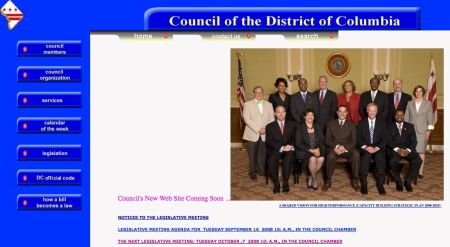 We wouldn’t have believed it had the City Paper’s Mike DeBonis not posted photographic evidence. The D.C. Council has apparently finally redesigned its hopelessly out of date, circa 1997 web site, complete with screaming hot blue and pink color scheme and blinking text headlines (pictured right). What has long been the laughing stock of the local government web world should soon actually look pretty good.