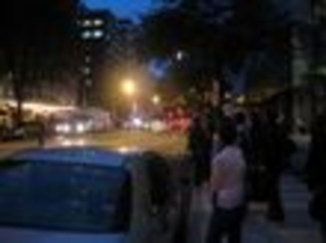 About 100 people gathered on the sidewalk around the Mayflower Hotel in downtown D.C. this evening to catch a glimpse of Democratic presidential candidate Barack Obama. Obama was scheduled to make a statement to the press at the hotel after leaving a meeting about the economic bailout package at the White House. Obama had met with President Bush, Republican presidential candidate John McCain, and congressional leaders. Neither McCain nor Obama made an immediate statement after leaving the meeting.