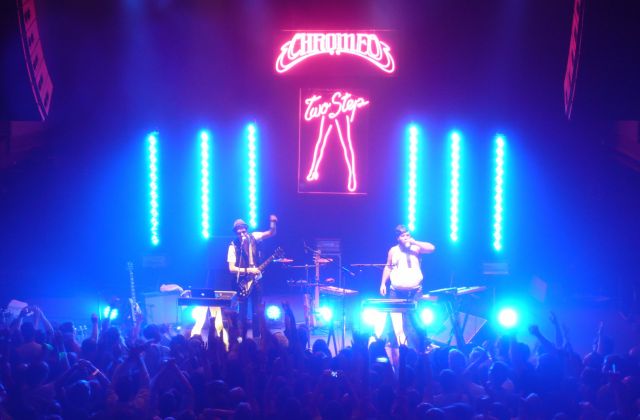 On Saturday night, the pair set up behind two mannequin-legged keyboard stands, flanked by six vertical banks of lights. Above them, true to their hilarious, self-obsessed 1980s pastiche, hung a neon sign of a woman’s legs scrawled with “Two Step” (a lyric from their hit “Fancy Footwork”) and above those gams the word “Chromeo” in arcing pink letters. The light show was good but not great.