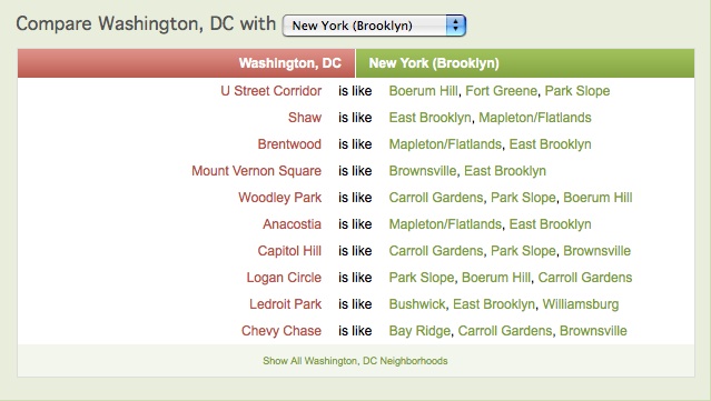 Gawker points out this new online tool from Homethinking that allows you to compare the neighborhoods of different U.S. cities. It’s a fine time-waster and a natural source of argument as to how accurate the comparisons are. Check out the D.C. to Brooklyn comparisons above — is Ledroit Park really more like Williamsburg than Shaw is? Probably not. It’s also not quite finished, it seems, since comparisons to Philadelphia yield entirely unhelpful results. Still, some of the comparisons are fun to sort through (the L.A. to Manhattan one is pretty good), even if some of them are just plain preposterous (Akron to St. Petersburg?).