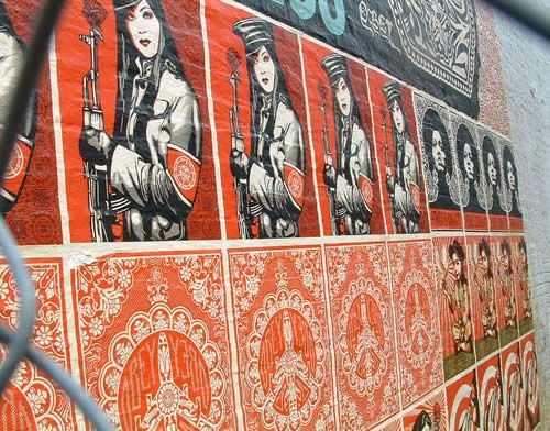 We spotted this new Shepard Fairey mural on 14th Street NW between U and V Streets last night, on the side wall of popular restaurant/bar Marvin. The artist put up another one yesterday on P Street in Logan Circle. Unfortunately, the view of the mural is a bit obstructed by construction fences and accompanying banners, but it’s definitely cool nonetheless. This mural is actually a made of many posters pasted up on the wall. Word on the street is that this mural went up Wednesday night, and that there may be many more around town. Has anyone spotted any other new Fairey works?