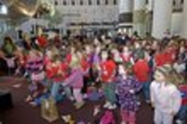 The Smithsonian Air and Space Museum sent us this photo today of a celebration yesterday in their Space Hall. More than 200 elementary school students danced the afternoon away to the sounds of children’s band Rocknoceros to launch the “Flights of Fancy” program, which uses activities, storytime and dramatic play to teach kids about all things air and space. After listening to some Rocknoceros tunes on their web site (and laughing giddily at the silly ’80s style design complete with waving space monkeys), we might just get up and dance, too.