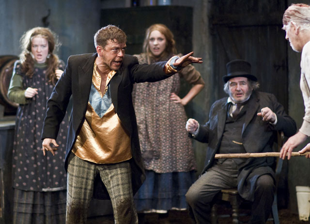 That’s the premise of The Playboy of the Western World anyway, Irishman John Millington Synge’s delightful 101-year-old play, which secured his reputation before he took his mortal bow at the tender age of 37. DRUID, the Galway-based theatre company, is performing the feature-length Playboy along with a quick Synge one-act, The Shadow of the Glen, at the Kennedy Center’s Terrace Theatre through Saturday night only. Closing-night tickets are gone, leaving you with two opportunities to catch the double-bill – and catch it ye should, surely!