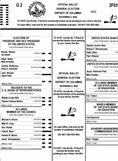 Take a close look at the ballot at right. This voter lives in single-member district 2F03, but the ballot includes the Ward 6 school board seat instead of the Ward 2 spot, and is also missing the Ward 2 D.C. Council member race.