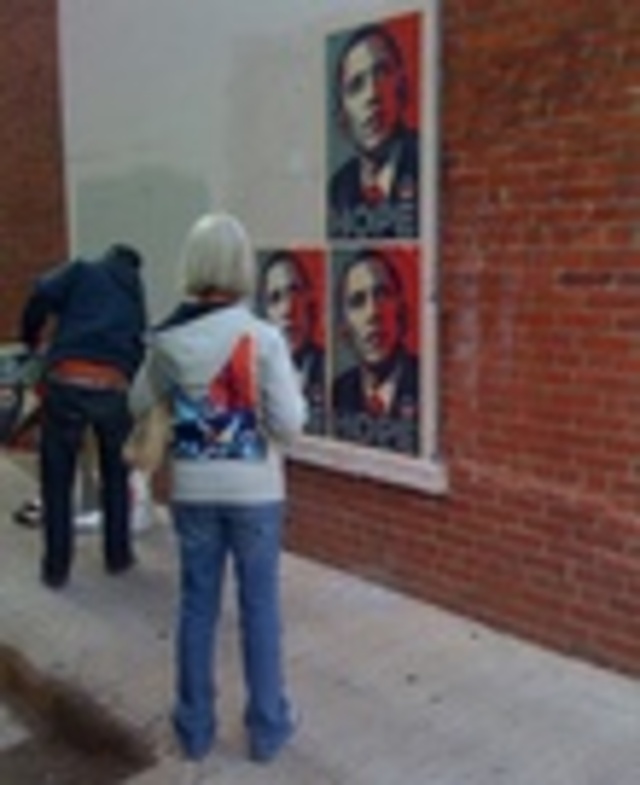 Another image from Shepherd Fairey’s recent tour of the District. It can’t be said how omnipresent Fairey’s image has become in America — from the minds of even the least-conscious undecided voters to every surface onto which an ad can be flashed. This writer, for one, hopes that an Obama administration does not mean that he has to gird his loins. But say that some international crisis did prompt President Obama to put the Constitution in a choke-hold. When he goes dictator, can any of us say we didn’t see the signs? They were all over our coffee mugs, t-shirts, alleys, even Psychofarm‘s photostream.