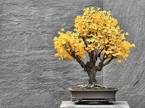 The golden yellow is such a perfect contrast to the slate gray in this photo. Flickr user *Toshio* found this at the Autumn Bonsai Exhibit (which ends on November 16) at the National Arboretum. EXIF.