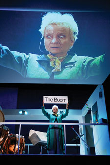 If it’s going to bug you that through about two thirds of Boom, Woolly Mammoth’s crazy new comedy, you still have no idea who that wacky woman in the headset is who’s literally pulling the strings of the players below, you’re probably at the wrong show. But if as an audience member, you kind of like to run with absurdity, you’re in for a fun (and eventful) 90 minutes.