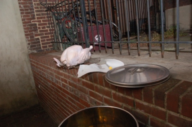 On the eighth day, God invented the turkey, so that man would have something to deep-fry. I have only come to this conclusion after years of doing my patriotic duty to consume massive amounts of turkey on Thanksgiving. The basic approach when frying a turkey is, well, rather similar to frying anything else. The main difference is the amount of oil involved (5 gallons in my case), and the lack of batter. The resulting skin is crispy and delicious, and the short cooking time keeps the meat from drying out. Also, once the turkey comes out of the oil, you now have a ready-made setup in which you can fry anything else that you might have in mind: chocolates, pumpkin pie, or in my case, bacon. The only real downside of this method is that there are no pan-drippings for making turkey gravy, but that can be remedied by separately roasting some turkey bits if you so desire. Here’s how you proceed: