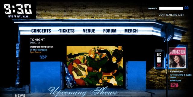 If you check up on local music schedules as often as we do, you’ve probably noticed that the 9:30 Club has launched a redesigned web site. With a big, colorful graphic incorporating the 9:30 Club facade in the banner art, it’s less stark than the old site, though concerts are still listed in a scrollable field.