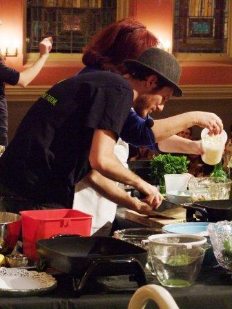 Former Top Chef contestant Spike Mendelsohn packed the Sixth & I Historic Synagogue on Sunday, the first night of Hanukkah, for a lesson in latkes. At Latke Mania, the reality TV personality turned Good Stuff Eatery burger slinger earned laughs lighting a menorah with a butane torch, struggling through candle lighting prayers he said he stayed up all night learning, and bantering with his sous chef for the evening—his mom.