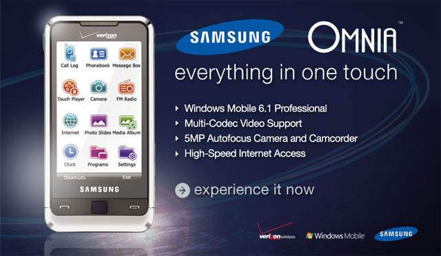 Like being ahead of the curve? Then the new Samsung Omnia is the phone for you. With features like high-speed internet access, GPS navigation, a 5.0 megapixel autofocus camera, a sweet multimedia package and Windows Mobile 6.1® Professional (PowerPoint, Excel and Word for your phone), you can take pride that your phone is an extreme cut above the rest.