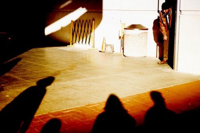Despite ccandumplins‘s protestations regarding her talent and experience at street photography, she caught something quite interesting here. The late afternoon orange tones; the line-up of spying shadow people; and the expression, posture, and slight overexposure of her subject all support her title: “Where are you gonna hide?”