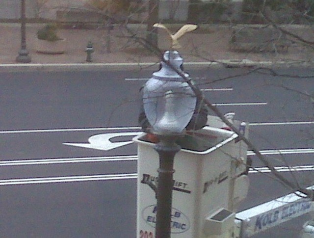 Reader Matt Ashburn sent in these captures of workers installing special street lamp globes adorned with golden eagles along Pennsylvania Ave. The eagles are being placed in time for the inaugural parade on Jan. 20.