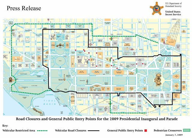 As expected, the U.S. Secret Service, along with regional transportation officials and the MPD, unveiled their plan yesterday to close all Potomac River bridge crossings on Inauguration Day. The announcement also included the above map, which shows plans to close off almost 3.5 square miles of downtown Washington to vehicular traffic starting at 3 p.m. on January 19 until the morning of January 21. You can download PDFs of both the Law Enforcement and Public Safety Public Affairs Subcommittee Joint Transportation Plan and the Secret Service Security Plan at the D.C. government’s Getting There web site. Both documents contain extensive information on road closures and restrictions throughout the inaugural celebration period. Maryland and Virginia also have special web sites set up with the latest information. Below the jump, you’ll find excerpts from the recent announcements that include lists of road closures and traffic restrictions. Of special note for those of you planning on walking down to the National Mall for the inauguration will be the list of pedestrian access points — you’ll want to pick which way you plan to walk before you set out that morning, or you may find yourself stuck.