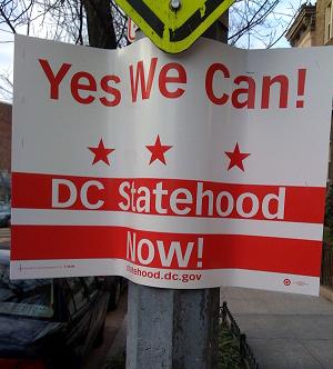 Over the weekend, D.C. voting rights activists hung signs advocating for statehood. Designed to look like the District’s flag and emblazoned with Obama’s “Yes We Can!” slogan, the signs were the brainchild of Shadow Senator Michael Brown and paid for by the D.C. Statehood Fund. The fund collects money from the check-box on D.C. tax forms that allows residents to donate money to education and lobbying for voting rights. Brown said that he and fellow Shadow Senator Paul Strauss, Shadow Representative Michael Panetta and 50 volunteers were out hanging signs over the weekend; of the 10,000 that were printed, about 8,500 went up.